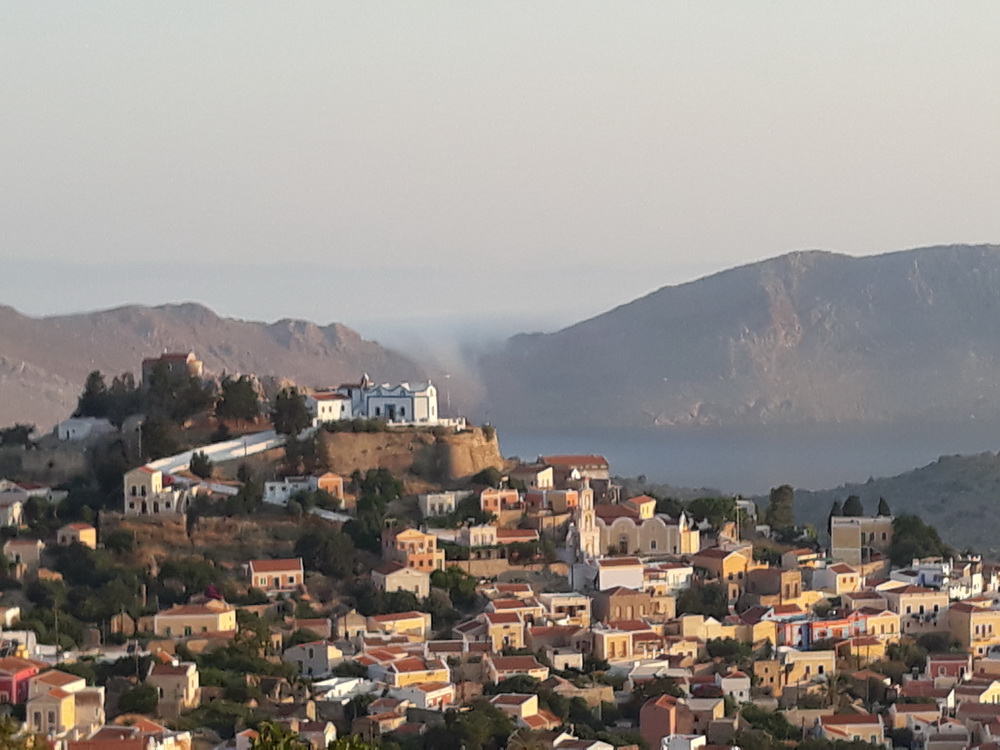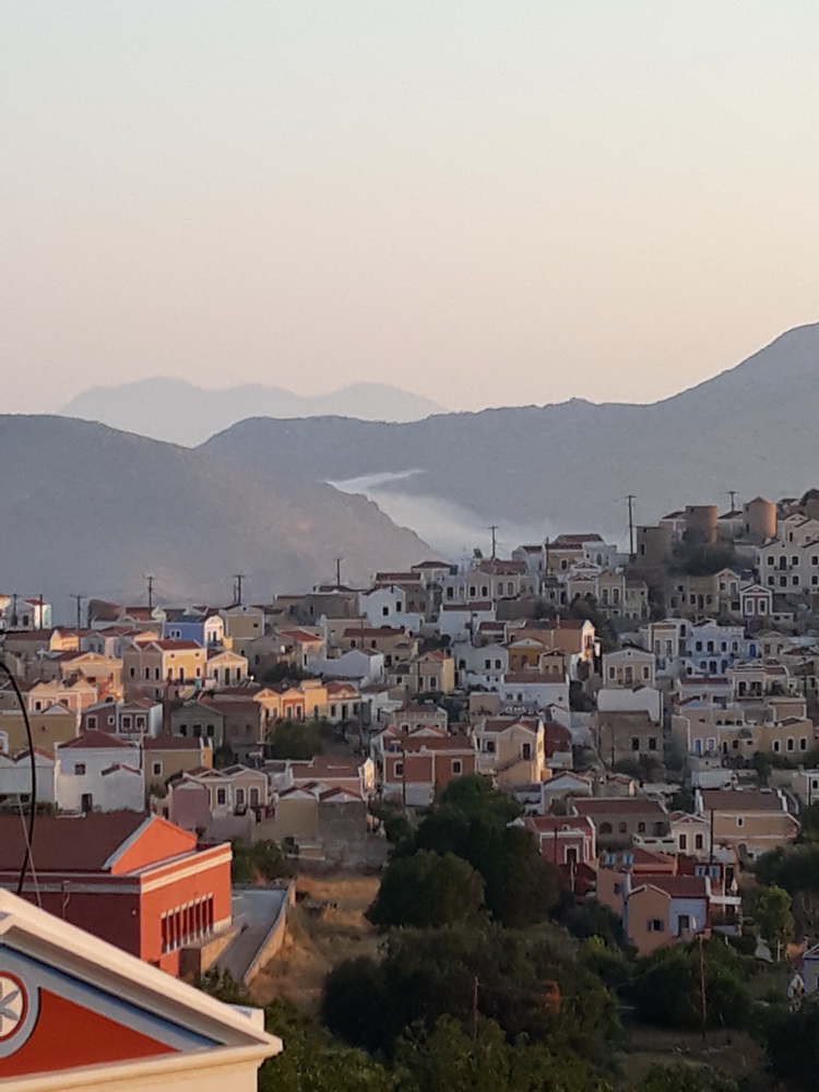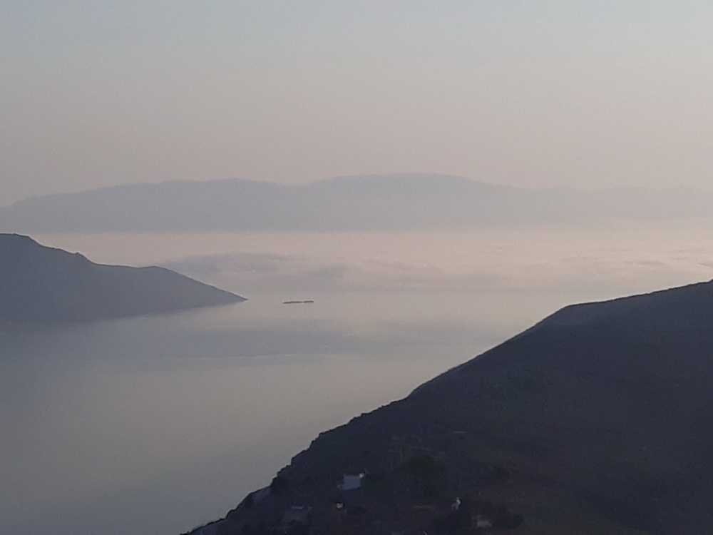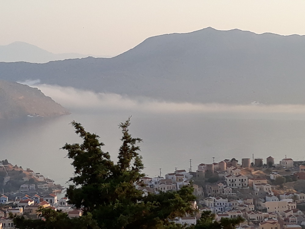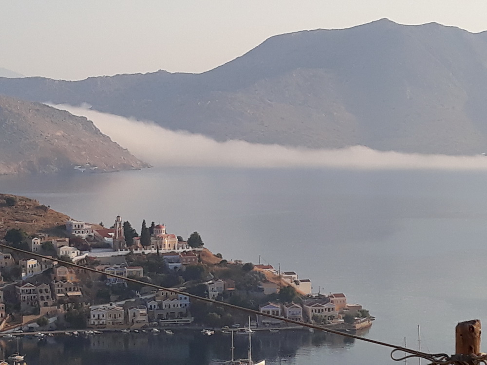The season of mist and mellow fruitfulness it isn’t, we’re still in summer and not Keats’ autumn, and yet yesterday was a morning of mist and mellow… something, I dare say. The balcony rail was damp at four in the morning, and the night was sultry. The Blue Star came in slightly late, perhaps it had been delayed by fog, and there were banks of it rolling towards Symi from the north-west, pouring between the island and the islet of Nimos, and creeping up and over the west coast of the island above Nimborio. My phone camera’s zoom had some trouble focusing, but I hope you get the picture from these pictures.