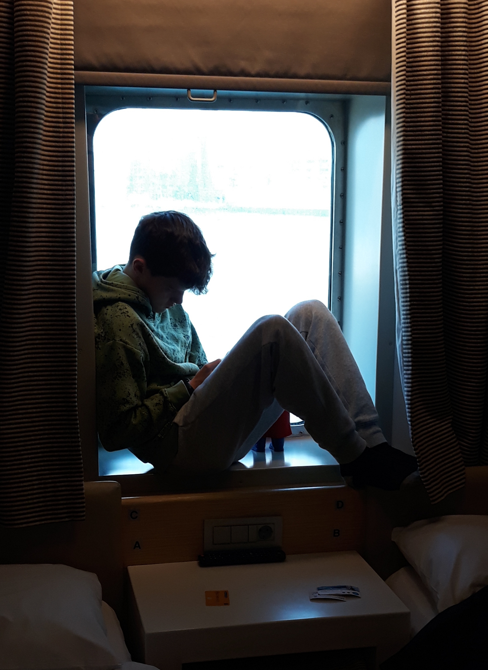 Cabins can be tight. On occasion, Neil and I have had to call, ‘I’m coming out,’ when leaving the bathroom, so as not to whack the other person with the door. Oh, cabins have bathrooms, btw, or shower rooms with a shower, WC and sink. All very nice. The bunks are fold-down for the upper ones, and it’s important to remember not to move the ladder if you are below and get up before your companion, else you will leave them stranded above. There’s also a narrow wardrobe, life jackets, and the ladder, a desk, TV and a chair. There’s a phone too, so reception can ring you with an alarm call.