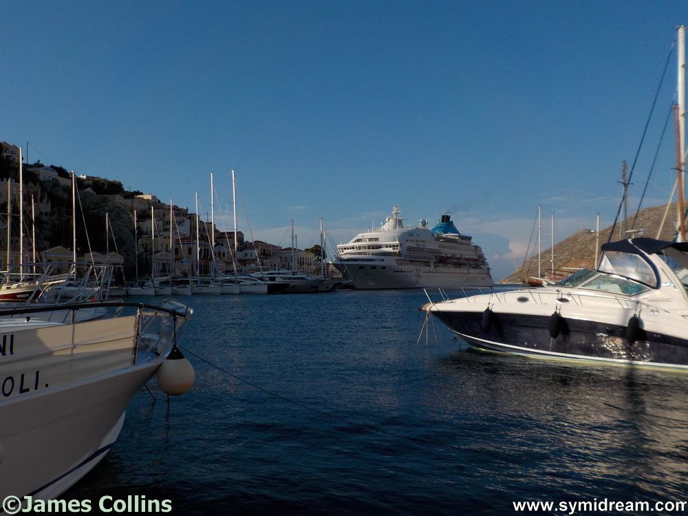 It started with the Panagia Skiadeni going out at 7.00 and the Blue Star Paros coming in at around 7.35. Later in the day a cruise ship called in and took up the far side of the harbour so when the Panagia came back it had to moor up where the Sea Dreams usually goes; that had to wait out at sea while the Panagia got its passengers off and then that went out so the Sea Dreams could come in. Somewhere in all of that the Nikolaos came in and let its passengers off before going back out to wait in the bay. Later, the Sea Dreams went, the Panagia came back, the Nikolaos came back, picked people up and went, and the Panagia went, and all the while the cruise ship, the ‘Salamis Filozenia’ was still there with its passengers enjoying a day on Symi, and that finally went in the evening. Not sure it was all in that order but it was certainly a complicated dance of swapsies. Bravo to the harbour crews!