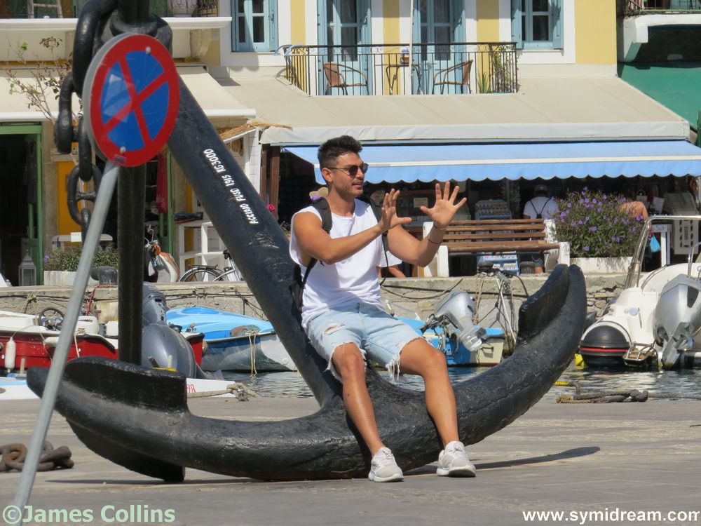 I did manage to get out and about with the camera on Friday. Well, I went to Yialos with it to post a package and find some bits and pieces. It was fairly busy down there, with four day-trip boats coming in and groups still being shown around the harbour on their tours. The train was running – cue sound of happy clapping, Zorba’s Dance and the bell – and people were taking photos of each other lying on the anchors or under the Fisherboy statue. It all felt quite festive and holiday-like.