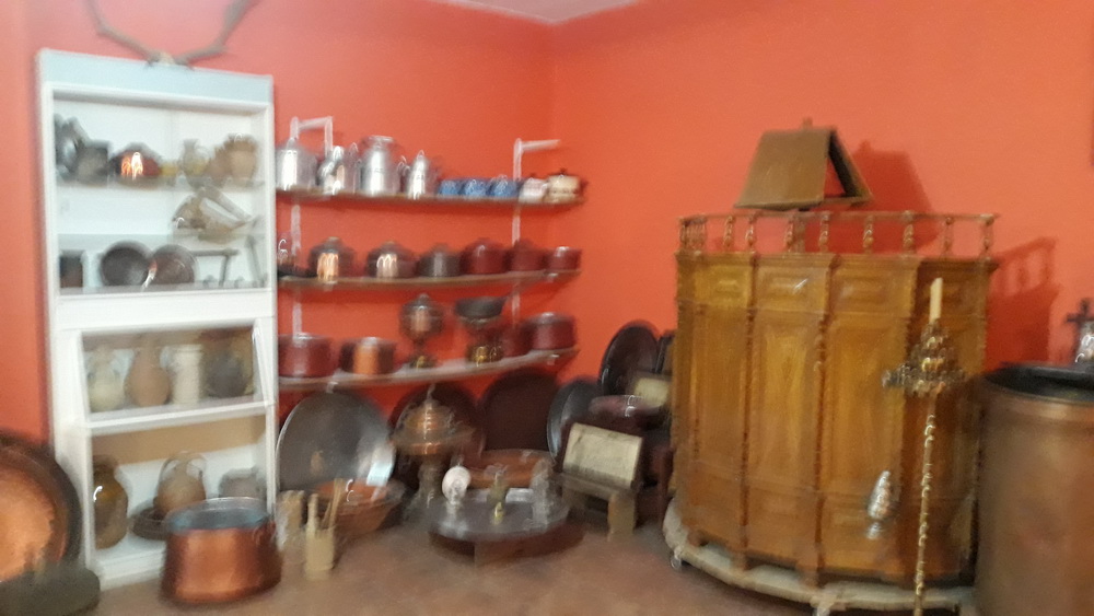 Sorry about the rough photos by the way. Downstairs is another treasure trove with items from Symi commerce over the years. Here, we were shown pottery and glass, bread-making items, sewing machines, church items, copper cooking pots… There’s a whole section dedicated to coffee with grinders and brikies, a selection from WWII, shells and the like, printing presses and bocks, shoemakers equipment, goldsmith’s tools… You name it, there is something from each of Symi’s historical trades. There are even ledgers showing the import/export of flour from as far away as Australia.