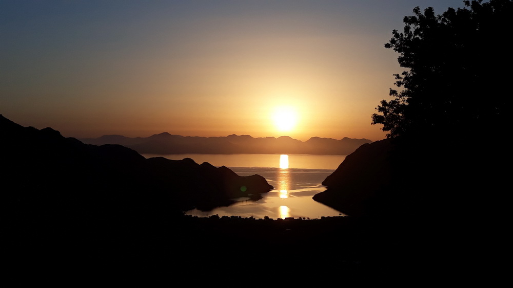 Continuing on, I made the last push to the cemetery. After there, the road flattens as its heads out around the hillside, rising steeply only now and then. Along that way, you pass the enclosure where my friendly goatherd keeps his pens, and that morning, he was among them doing some paperwork. I assume that’s what he was doing as, I noticed, he now has an office desk and a chair in the enclosure, and he was sitting at it. He looked as if he was about to interview a kid for an apprenticeship or give Old Billy his final warning. Perhaps he was about to interview a nanny; who knows? We exchanged waves, and I decided against taking a photo as it would be rude, and carried on. Around a corner, along a gentle rise, past Yianni’s house high on the hill to the next bend, where I paused to sip some water and watch the bay light up in gold.