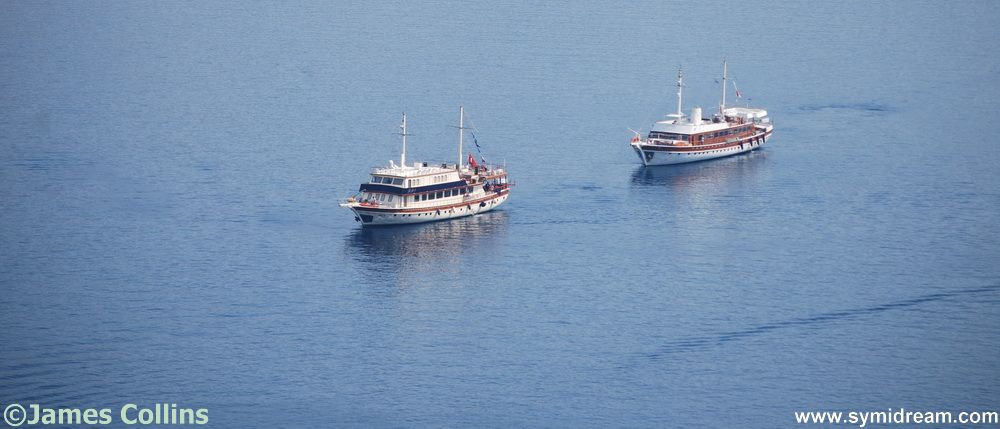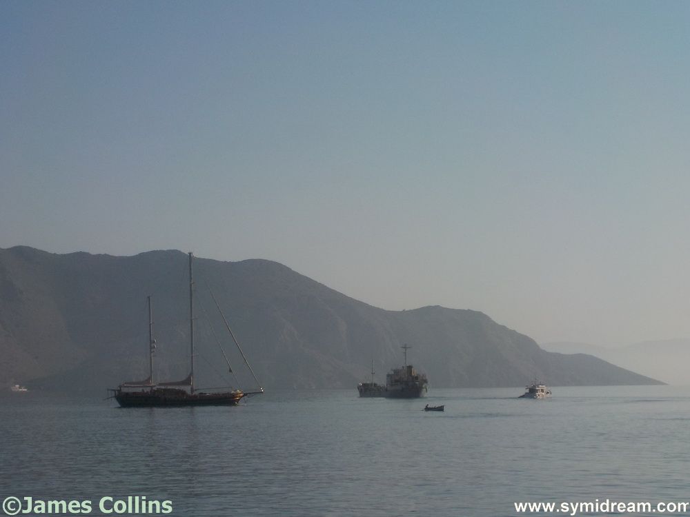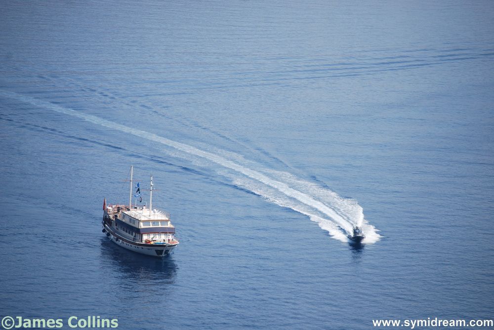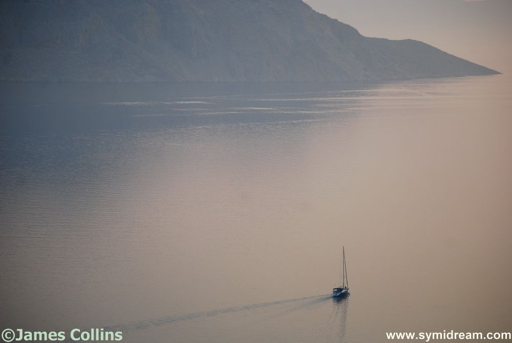Back down through the village, no one around yet, apart from those still celebrating the new day at the Jean and Tonic bar, the bakers still baking, Lefteris watering plants and Nikitas opening the kiosk. Crossing the square I can hear the Panagia Skiadeni heading out, assuming the fit family made it, and back to the house where Neil is just up and the cat is already flat out and fanning himself with a delicate cat fan from Andalucía. Shower, and to work by seven. And the photos today were taken as I was working at the desk and so are rather boring but show you some boat activity on the bad-joke flat calm sea. And I made up the bit about the cat’s fan. It’s actually from 島牧村 (Shimamaki, Japan), he picked it up there last time he visited.