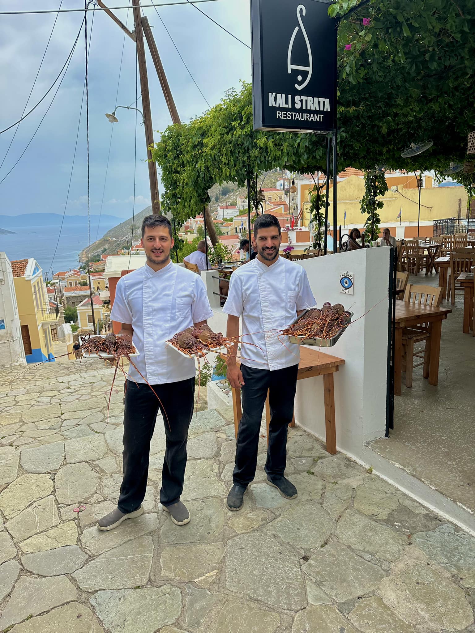 Which is where we came in. With the opening of Kali Strata comes a modern approach to Greek dining, with an excellent menu, good food, a great cast of staff and the perfect view. What’s also nice for me, though, is that we have, from a distance, seen the guys who run it grow up for the last 20 + years. It also continues the tradition of family-run, with the brothers in the kitchen, dad on front of house, the grandparents on hand. Also, the staff they employ are young, thus, giving younger people a chance for work and a career so hard to come by in Greece today. One of them is our godson, working his first job, and discovering (to his delight) what it’s like to work eight hours a night, seven days a week.