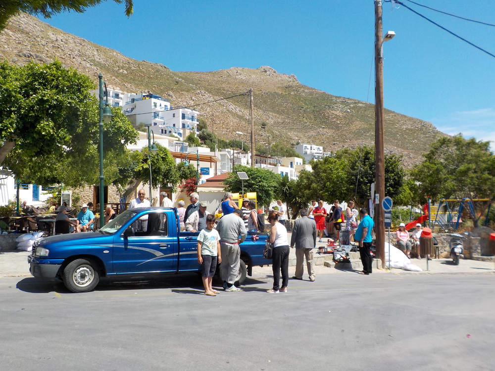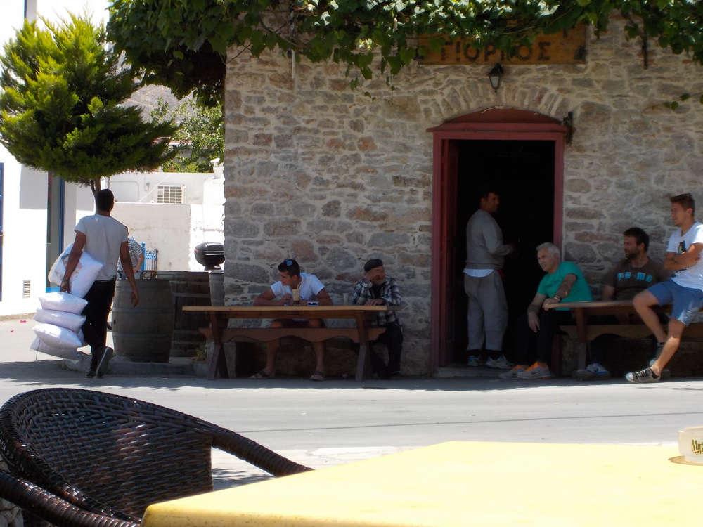 That done, and the idea of any more writing now out of my head until I’d eaten, I then went down to the square, 30 yards away, for a pre-dinner drink. Here I was treated to either a large group from SAGA (bless ‘em) or the local ex-pat over 60 club discussing Stavros’ new baby and Dinos’ new grandson, what ‘she’ did last Sunday and how ‘he’ asked for a small boy rather than a cucumber and ‘wasn’t that the funniest thing?’ (and a little risqué) and where I also bumped into the Greek (Athenian, I think) family who have a holiday home next to the old Symi Dream shop, on holiday with their two children – and isn’t it a small world? Coincidence number two of the day.