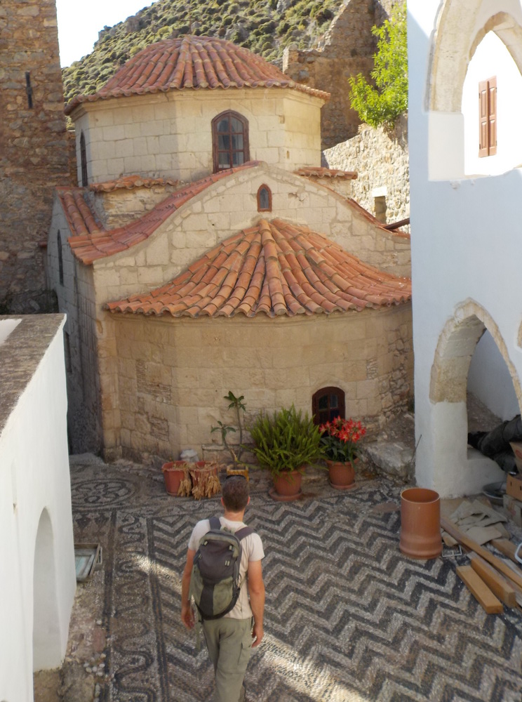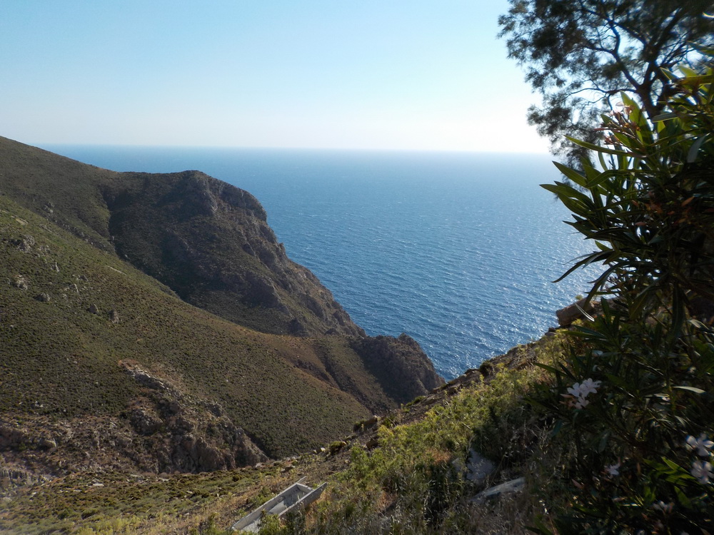 That done, I was then planning a sandwich and a kip (both of which I had) and then some more writing, but Andreas, the owner – remember? – invited me out on a drive to the monastery of Agios Panteleimon, at the far side of the island, to collect some spring water and, well, away we went, with Irina, and with Melissa who happened to be passing as we were getting into the van – Melissa is a singer/songwriter with a band based in London, her singing partner was born on the Romney Marshes, as was I, so talk about… whatever it is you talk about when coincidences happen on small islands.