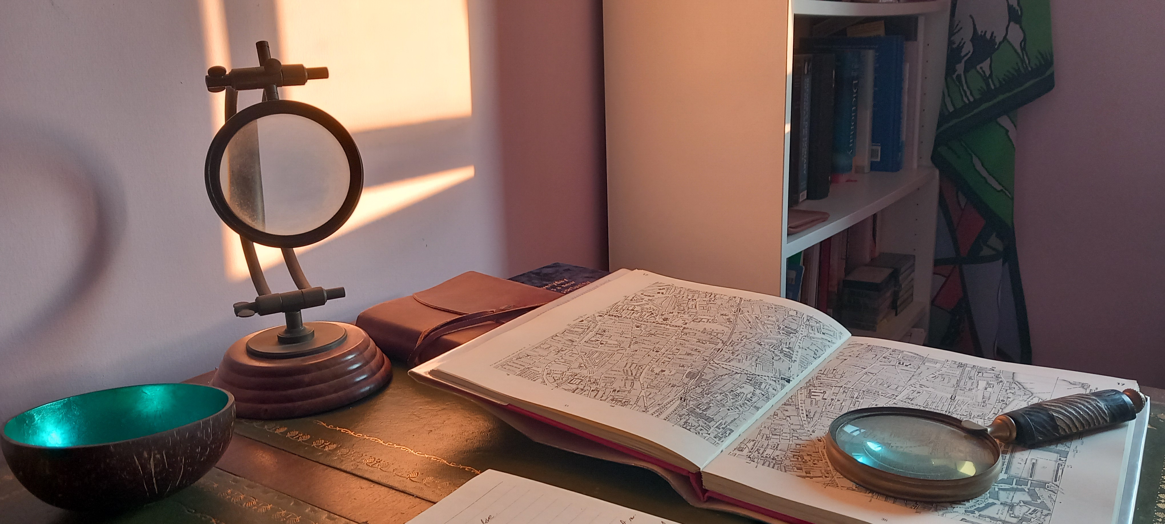 Another habit: ending the week with a selection of photos because I’ve run out of things to say. Today’s are an odd mix of my trip to Rhodes on Wednesday, some research I’ve been doing, and a rather nice one of my desk in the early morning. That’s my A to Z of London as it was in 1888, a book published in the 1980s containing maps drawn and published in 1888, and very useful for being accurate when talking about journeys, and when finding places that existed then, but don’t now.