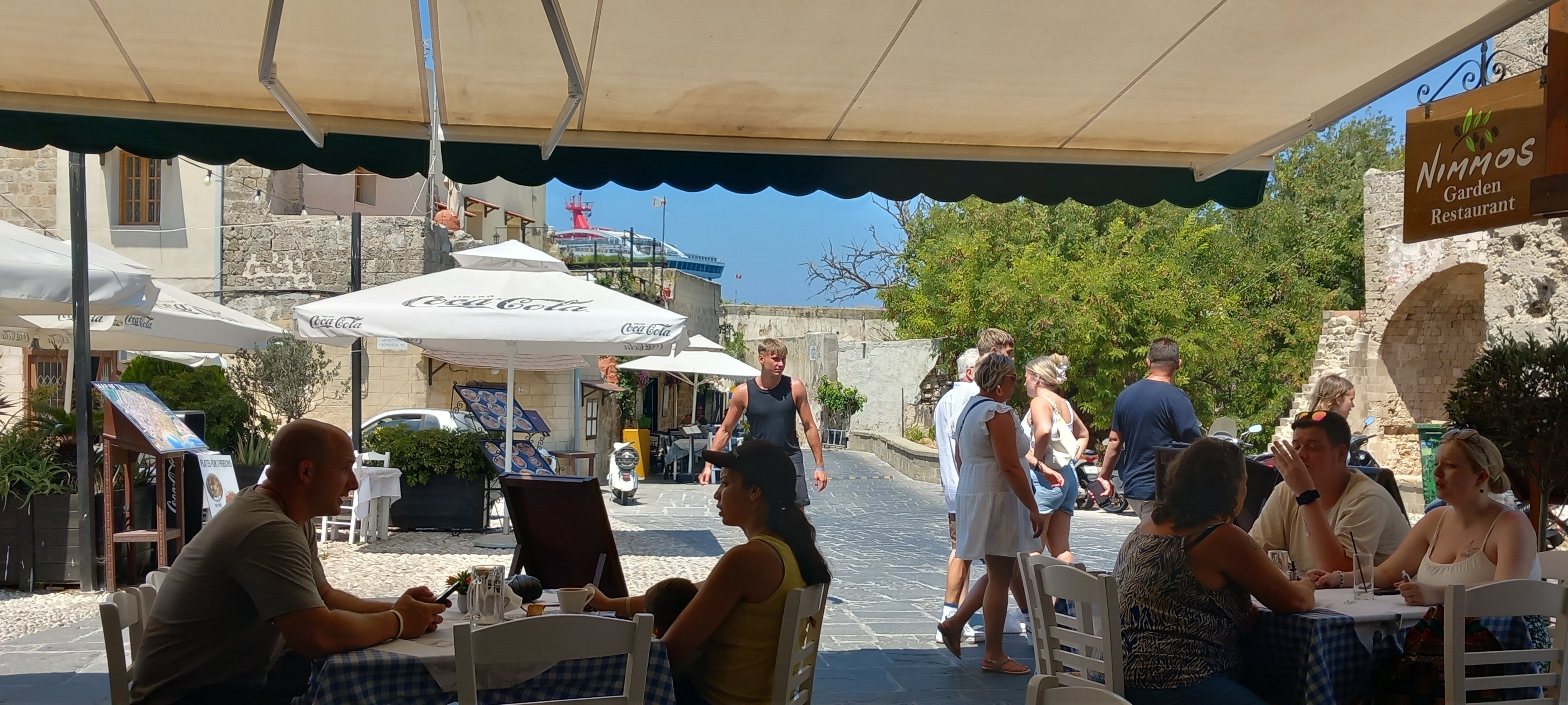 The food image was taken at Nimmos Taverna in Rhodes Old Town. This is the place I use when on my way back to the Blue Star at Akandia, as it’s not a long walk after lunch. You arrive on Rhodes in the early morning, get all your jobs and visits done, and then have a late lunch at Nimmos with ‘the boys’ who I’ve kind of known since they were six or seven and who are now in their late 20s, and then waddle off to the boat afterwards, sometimes via Kanadis Street and the large supermarket to pick up decently priced tea bags and the like.