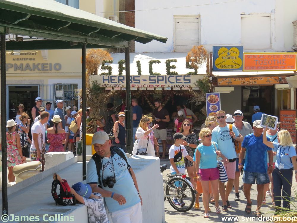A walk down to Yialos, a visit to the post office, the bank, the pharmacy, all the things you can’t do in the village, that was Tuesday. We also stopped for lunch at Meraklis and watched the day-trippers pass by. Crab salad and gigantes for me, fish and potatoes for Neil. A ride up the hill to work for one, and to play the piano for another, and then a couple of hours in the square chatting to first-time visitors. That was the rest of Tuesday. Apart from sitting on the balcony watching the nearly full moon come up over the hill. (Not as good a shot as yours, Steve, but the best I could do.)