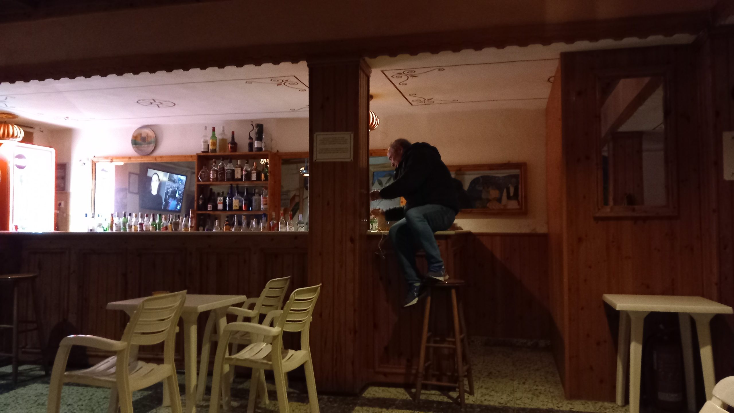 Let’s start today of with an unexpected photo of Yiannis doing some wiring work in the bar on a January evening. I think he was tidying up the internet line to the modem. This, a few years ago, would have been an unheard-of sight – a modem in the Rainbow Bar I mean. Not so long ago, all there was in there was a public telephone, which was more private than the one in the square, or the one on the corner of the Kali Strata where the bar used to be. There were others, but I only ever used those three. This was a long time ago – when we first moved here in 2002, we had no internet at home, and had to walk down to the Roloi bar in the back street to see another Yiannis and use his internet café at 56kbps dial-up, but we could only do that at times when he’d paid his phone bill. Now…? Well, now, we have 150 Mbs at home, and landlords wiring modems while owning two mobile phones – mind you, one of them is about 20 years old. Anyway, here’s the photo.