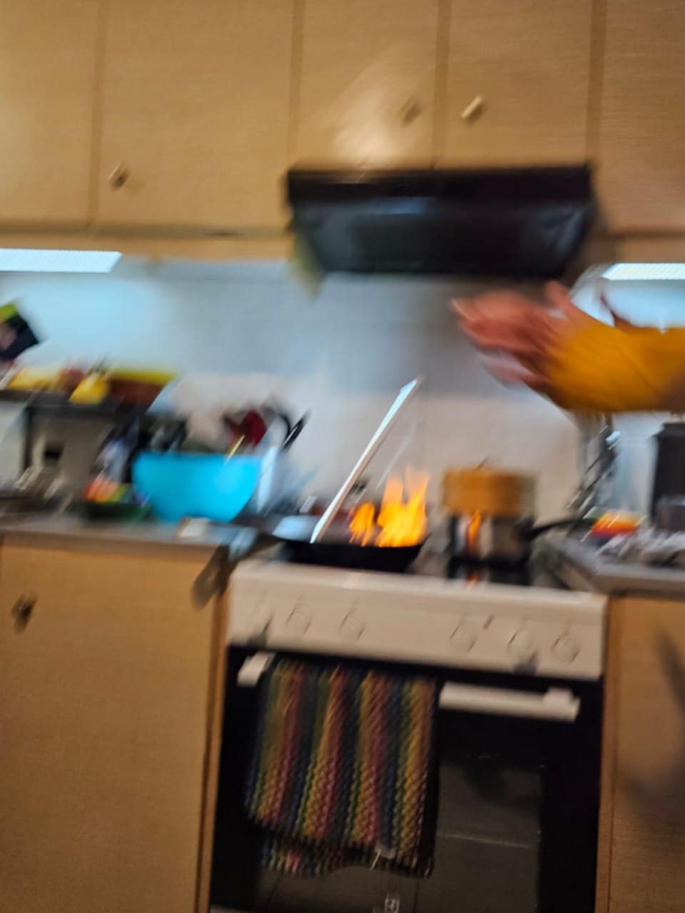 Another magic moment was caught on Sunday evening when Jenine was allowed to attend ‘Boys’ Night’, I cooked steaks, and, while flambéing, brought down the cooker light ’cos it’s only stuck on with magnets and it came from Temu, so what do you expect? It’s the white thing dropping into the frying pan, caught on camera by Sam, I believe.
