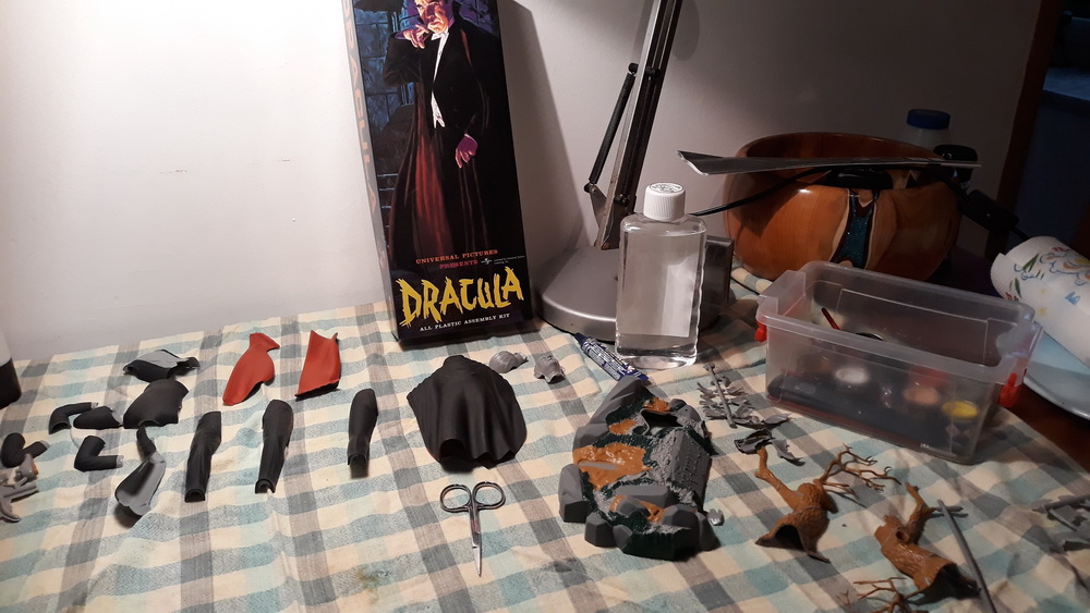Okay, so no stories were written, but I was able to continue work on last year’s Christmas present, a figure model (Dracula). I had started this in early summer, but the paint started to dry in the pots because of the heat, and winter is a better time for such things anyway. So, I picked it up and carried on at the kitchen table for most of the morning and today, Sunday, it’s nearly done. I’ve not made one since I was 12 or something, and the results now are pretty much how they were then, but it keeps me off the streets and gives me something to do during bad weather.