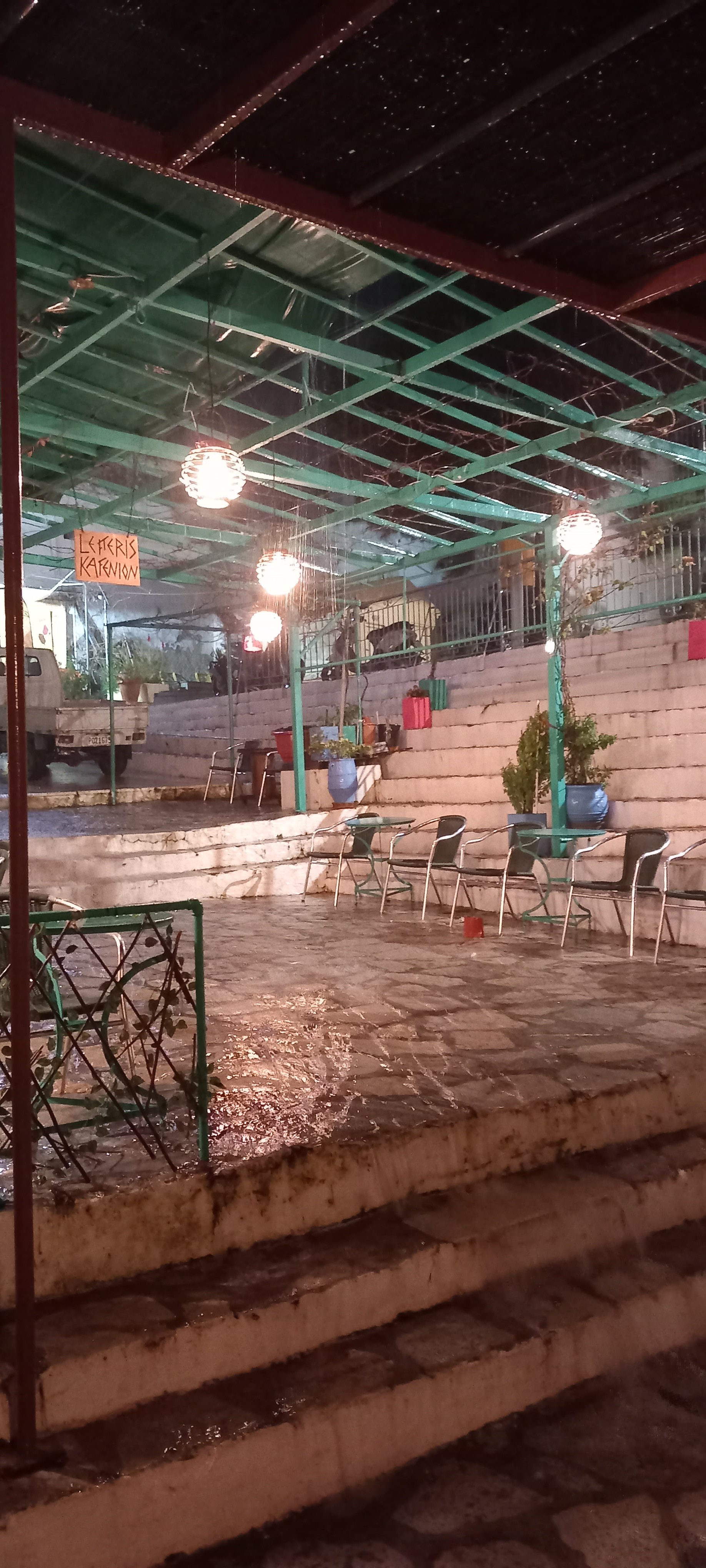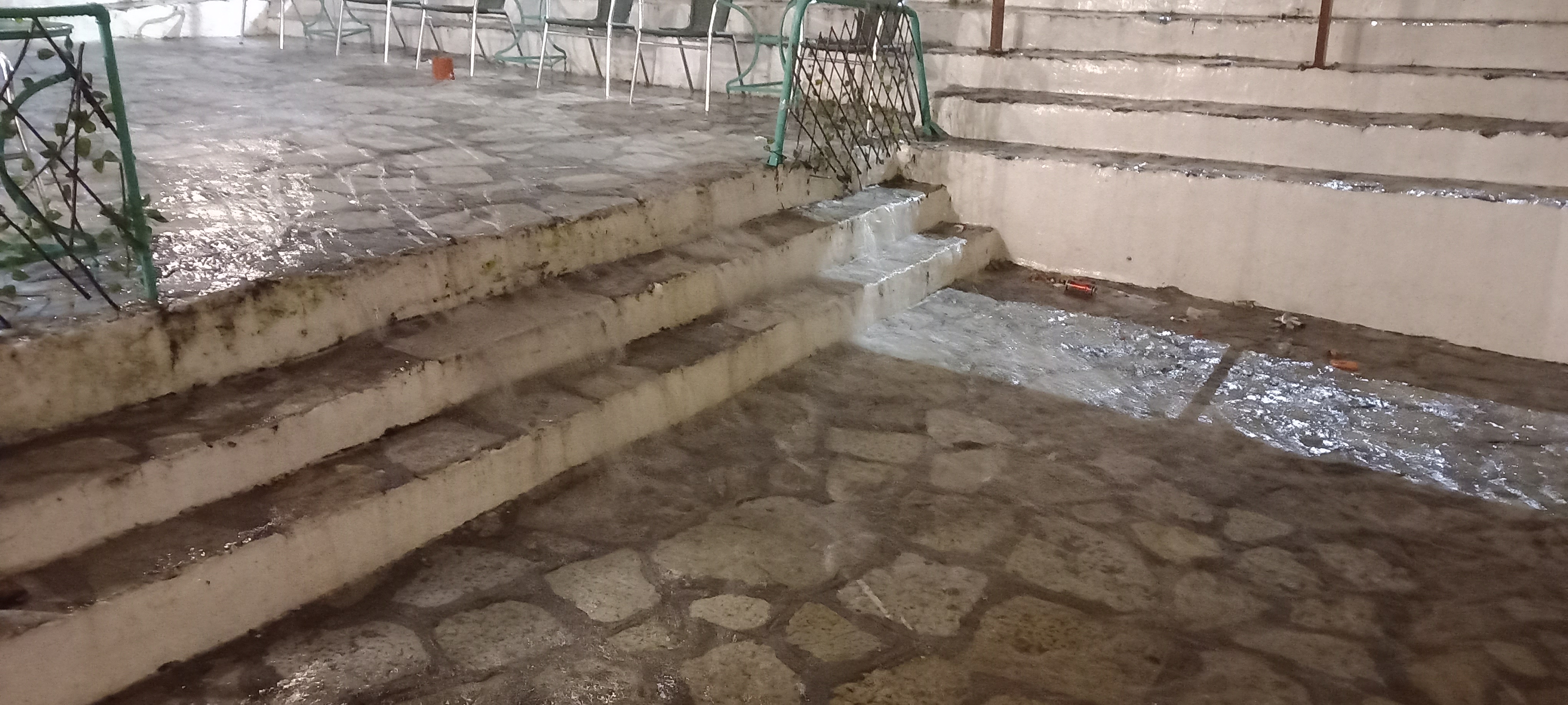 We had something of a storm blow through yesterday afternoon and evening. The edge of it is still hanging around in a stiff breeze and a few clouds, but otherwise, everything’s calmed down. We’d been summoned to Rainbow to see Yiannis who had been away for ten days, and were inside when the steps became rapids, as you might be able to see from the photos below. For a better idea, check the Symi Dream Facebook page where I shared one of Neil’s videos.