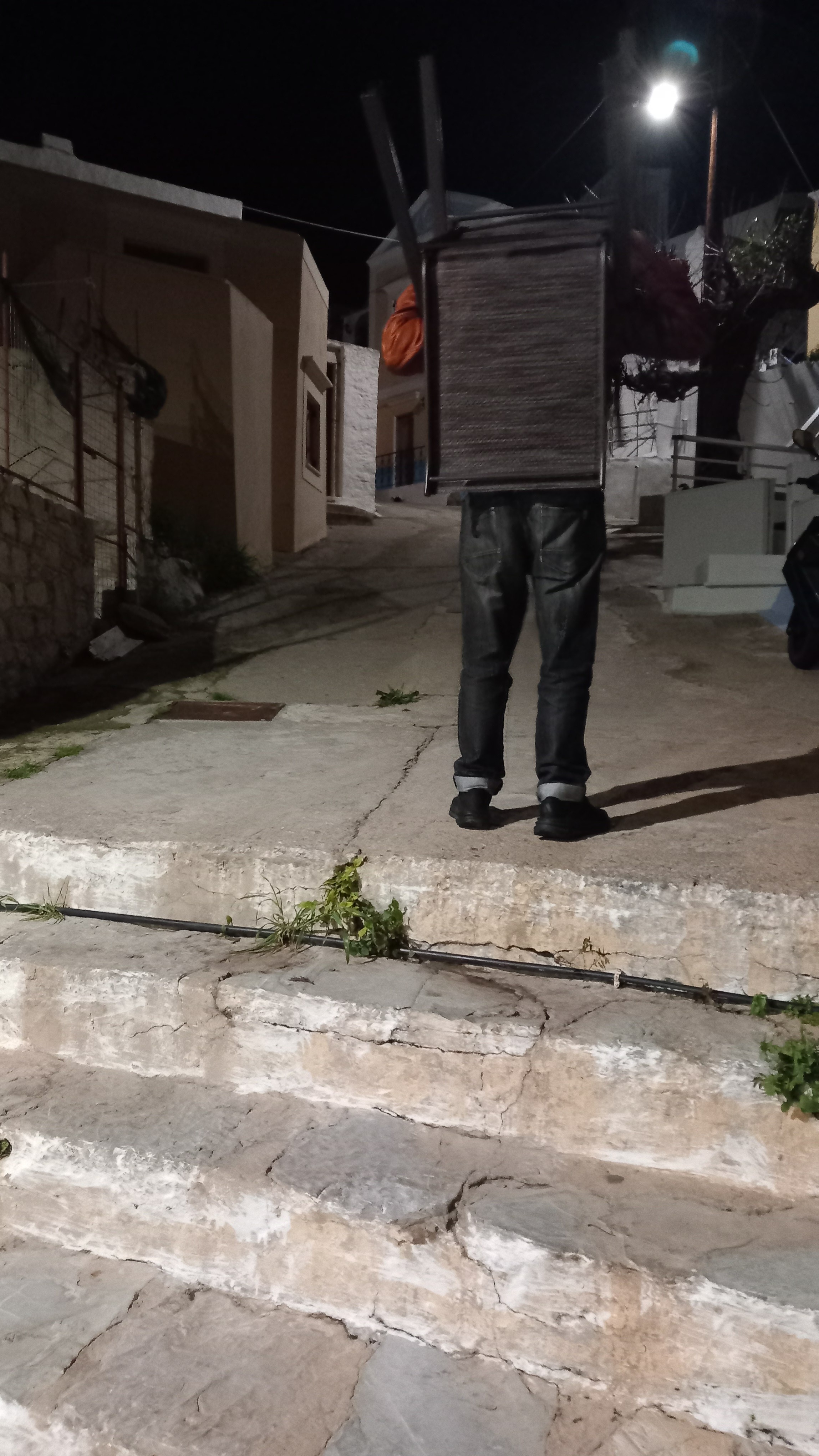 That was when I was out on a walk yesterday, just a short wander around the village to keep the joints moving. There will be more walking on Friday when in Rhodes. It’s so much easier to go everywhere on foot there, compared to here where there are so many ups and downs. I can quite easily walk six or seven miles during the day when in Rhodes. If I did that here, I’d be over halfway to Panormitis, or in the sea, depending on which way I went, and it would take twice as long because of the steps. Talking of steps, Neil carried the other Christmas present chair home the other night…