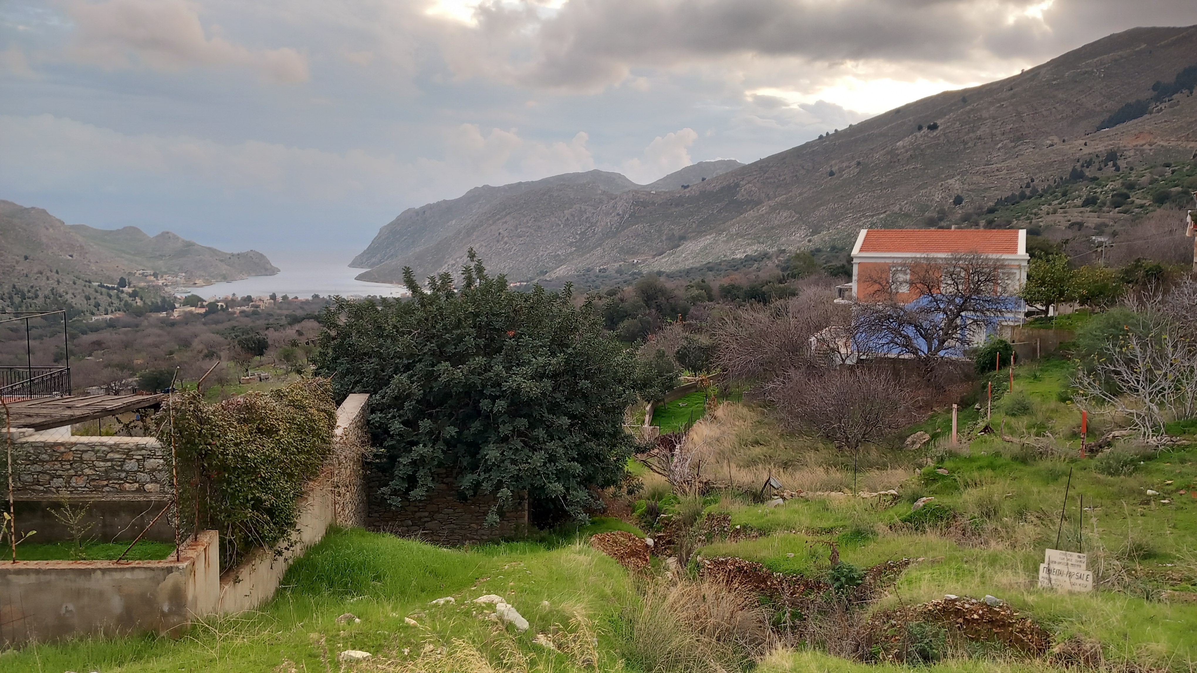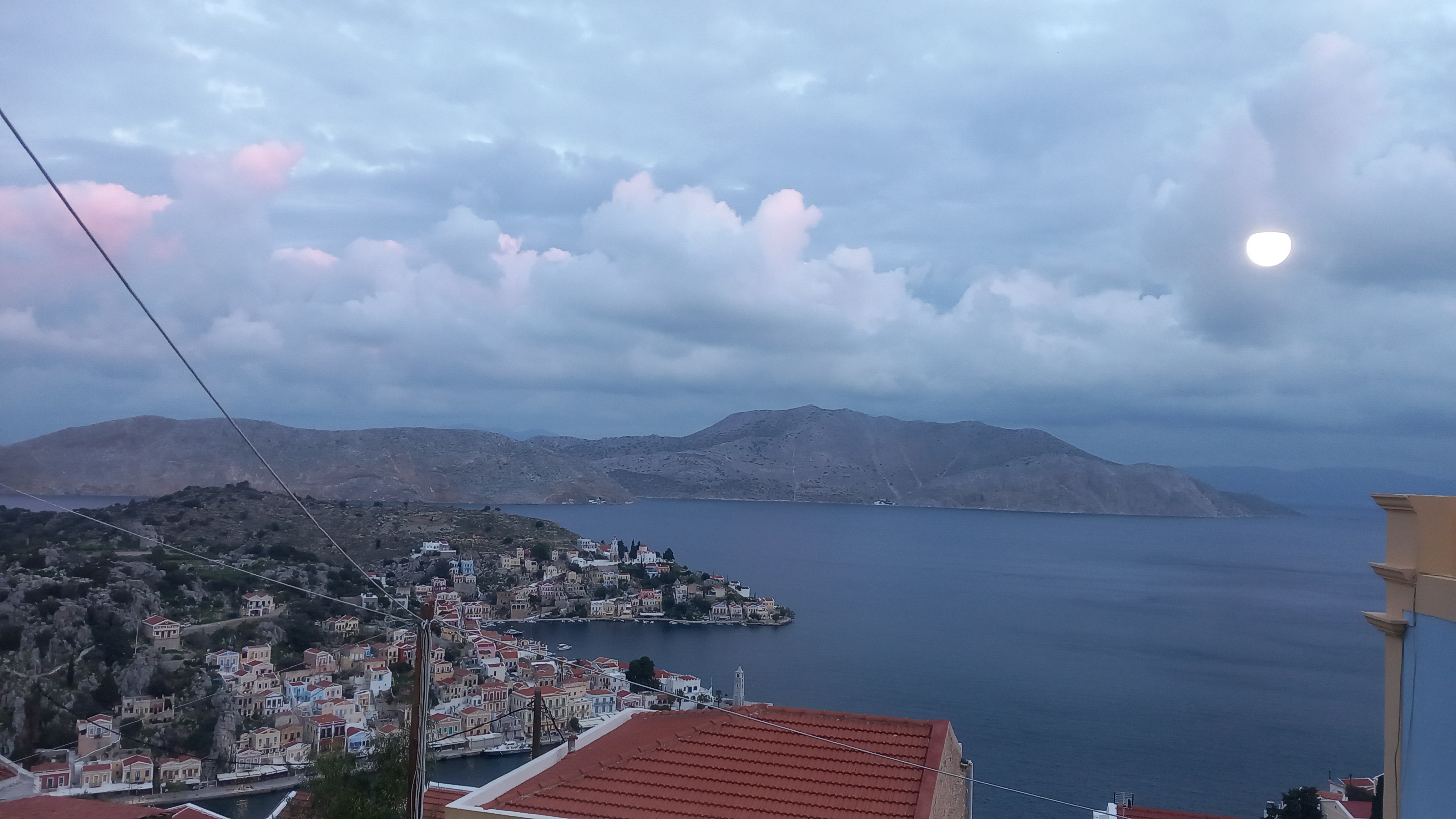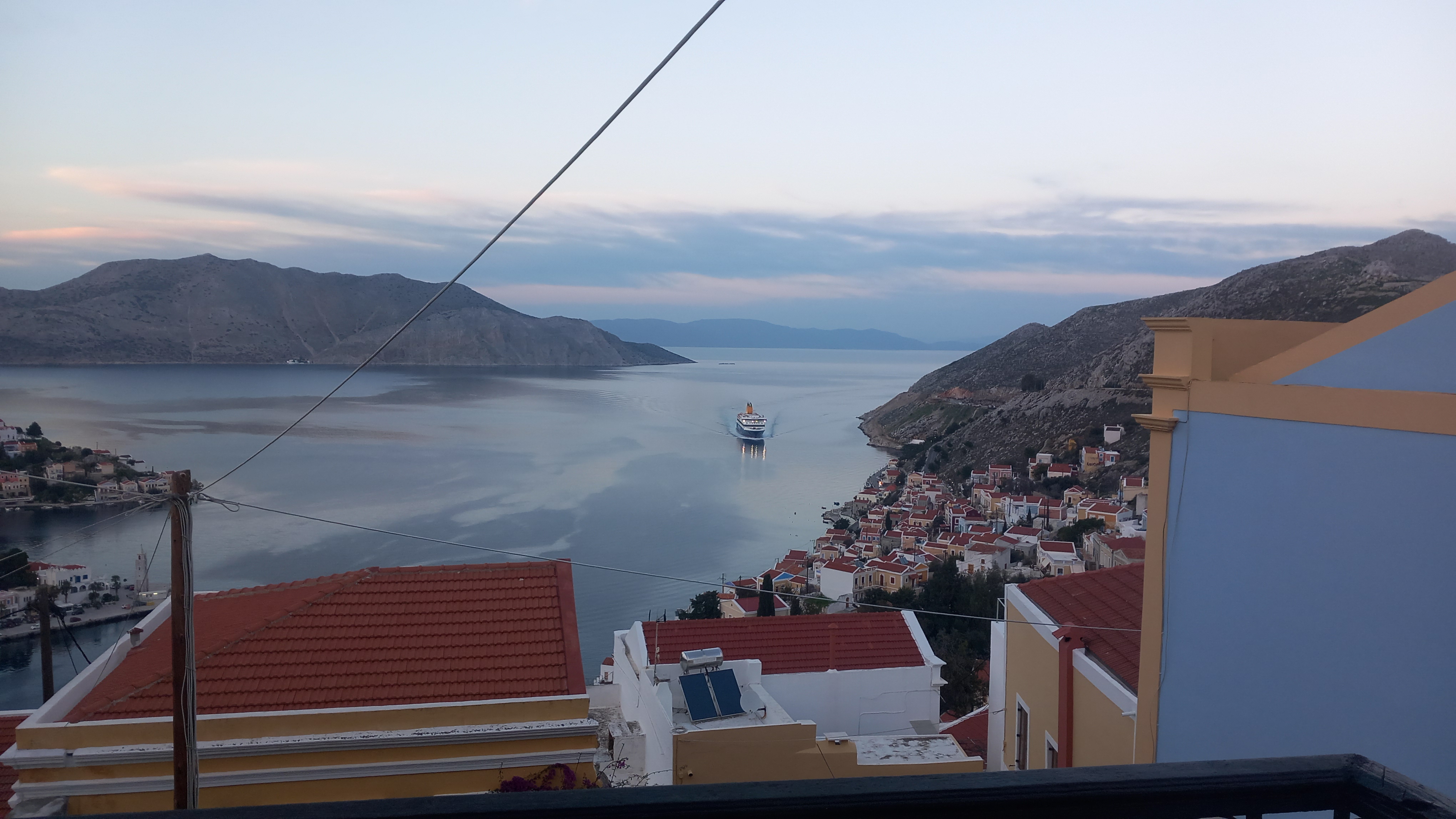 Also, when it’s wet, we tend not to go out onto the balcony, so the balcony photos like this one below are taken through the window. More cloud from yesterday, and beneath it, the Blue Star coming in early one Friday morning. I know it was Friday because, at the moment, it comes in before dawn on a Monday and Wednesday. Apart from the Stavros coming in, the patrol and fishing boats, that’s about as exciting as the view gets at this time of year, and what a lovely view it is.