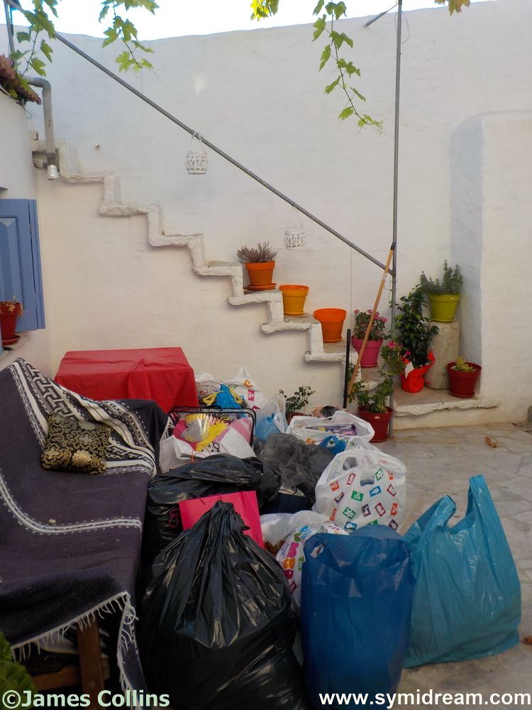 Back there, Neil had been tidying up with another volunteer and, as things were quiet for a change, we were able to sort donations and do bits and pieces. A lovely lady from Penzance was there and attended to the curtain in the medical room so now the doctors have a decent curtain which opens and closes smoothly – the little things really count! Other people came in with donations and Neil showed them around and showed them the work being done and how their donations are used. Thank you to the ladies who came with bags and also put money in the donation tin. There are very generous people coming on holiday to Symi.