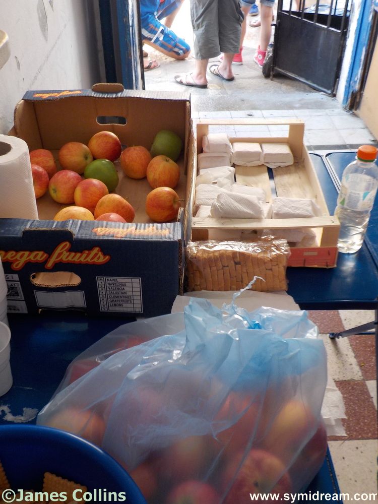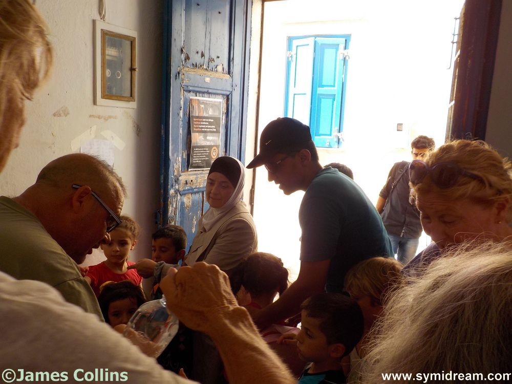 On Sunday night we went down to the harbour to take back the bags of washing we had done. Wendy Symi Visitor was in the old post office in the dying light (no electricity to the building) with some volunteers making sandwiches. That huge consignment of water you might have seen in yesterday’s post had already been distributed. The porta-loos were there but can’t be plumbed in until the council approves the work, hopefully that’s been approved by now, I’m waiting to hear. And there were some women and children waiting outside and asking us for water. As the aid station wasn’t ready to re-open we went and bought a six bottles (€2.00) and gave them out to those who were there, reminding myself that I should learn the Arabic for ‘share.’
