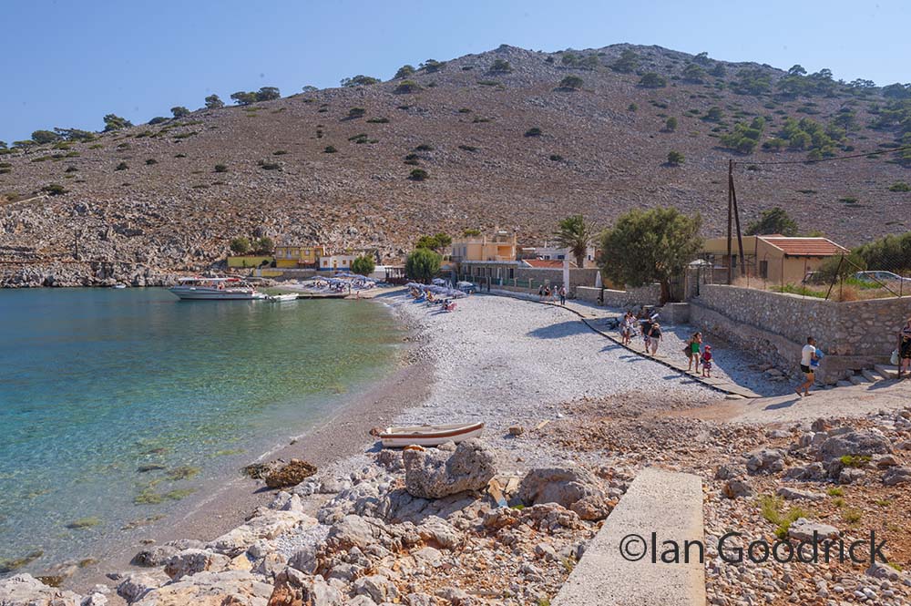 The road to Panormitis is a series of sharp hairpin bends that drop down to the monastery. By the time we arrived the only pies left were cheese so as we wandered around we were looking at everyone wondering if it was them that eaten all the pies. As time was short we did not do the museum leaving that for next year. A drink at the taverna and it was back in the bus and on to the beach at Marathounta. Here the big decision had to be made food or a swim. As it was very hot the swim won so after fighting the goats we had a short swim in the clear water of the bay.