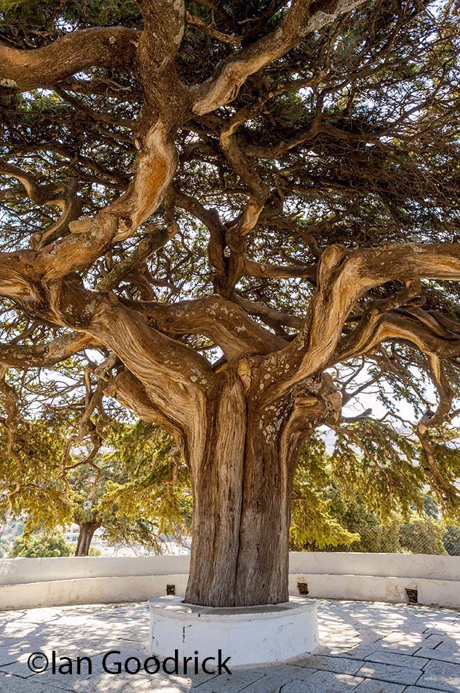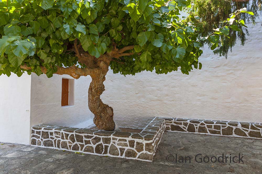 The next stop was the monastery of Michael Roukouniotis. We wandered all around the site looking at the old church sitting under the newer church, admired the frescos and the twinned trunk of two trees growing in the grounds of the monastery. Then as the heat got hotter we were on to the walk through the forest to see the ancient wine presses.