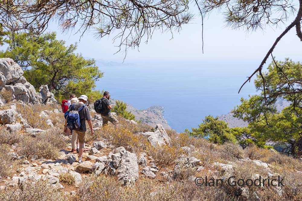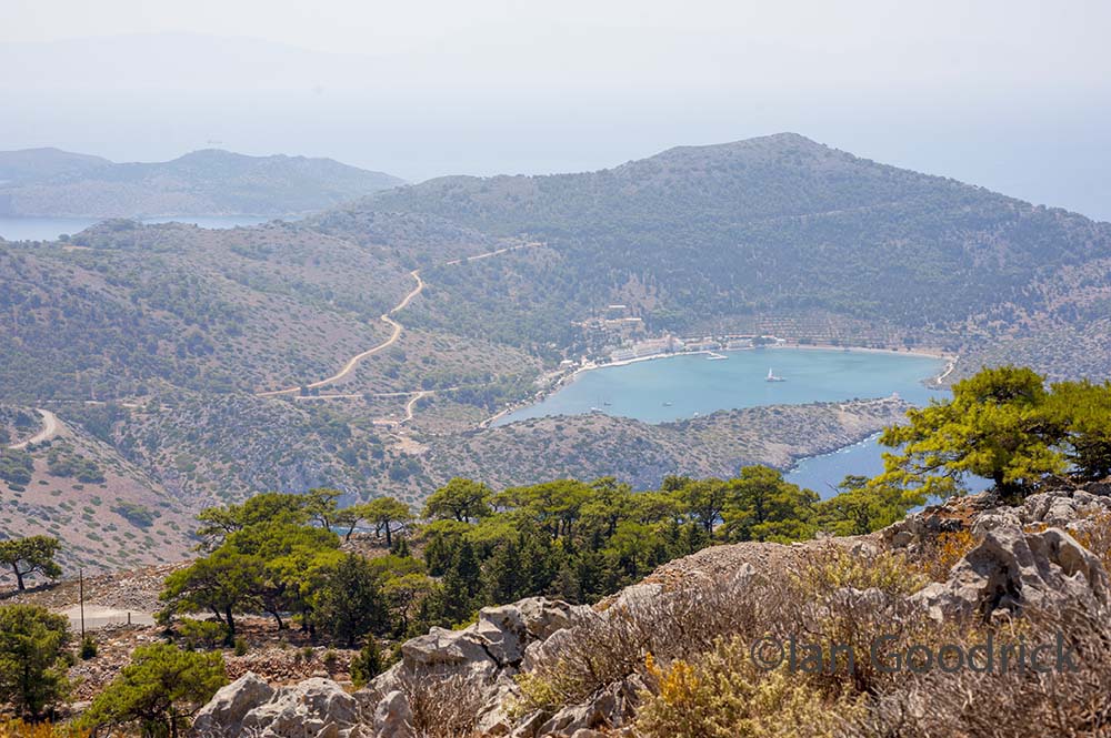 It was very hot as we waited for the bus at the Hidden Courtyard but soon we were sitting in the cool of the bus. At the first stop, just off the road above the town, we looked at the view of the town. The view was fantastic looking down on Horio and across the harbour with the hills of Turkey in the distance.