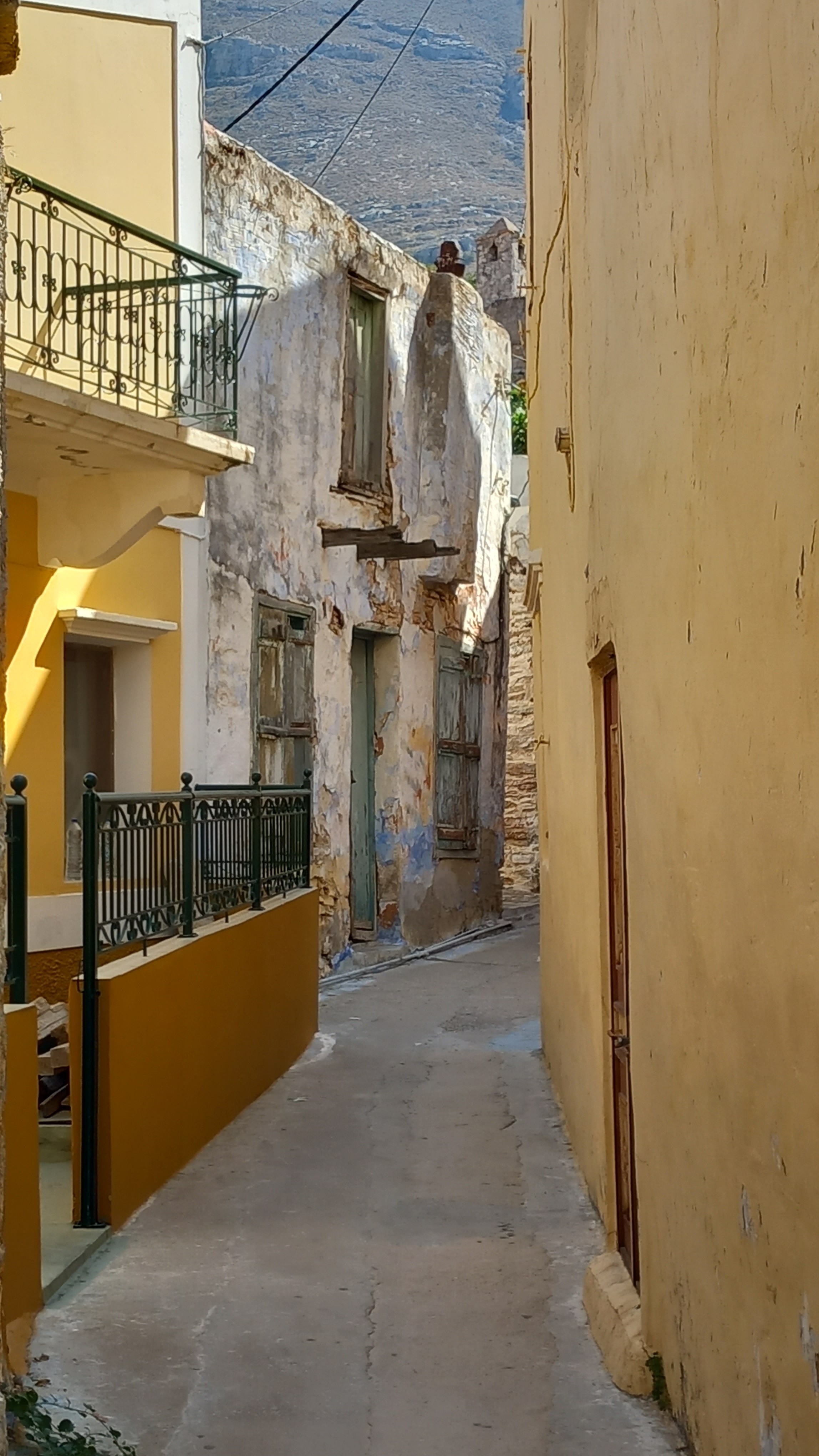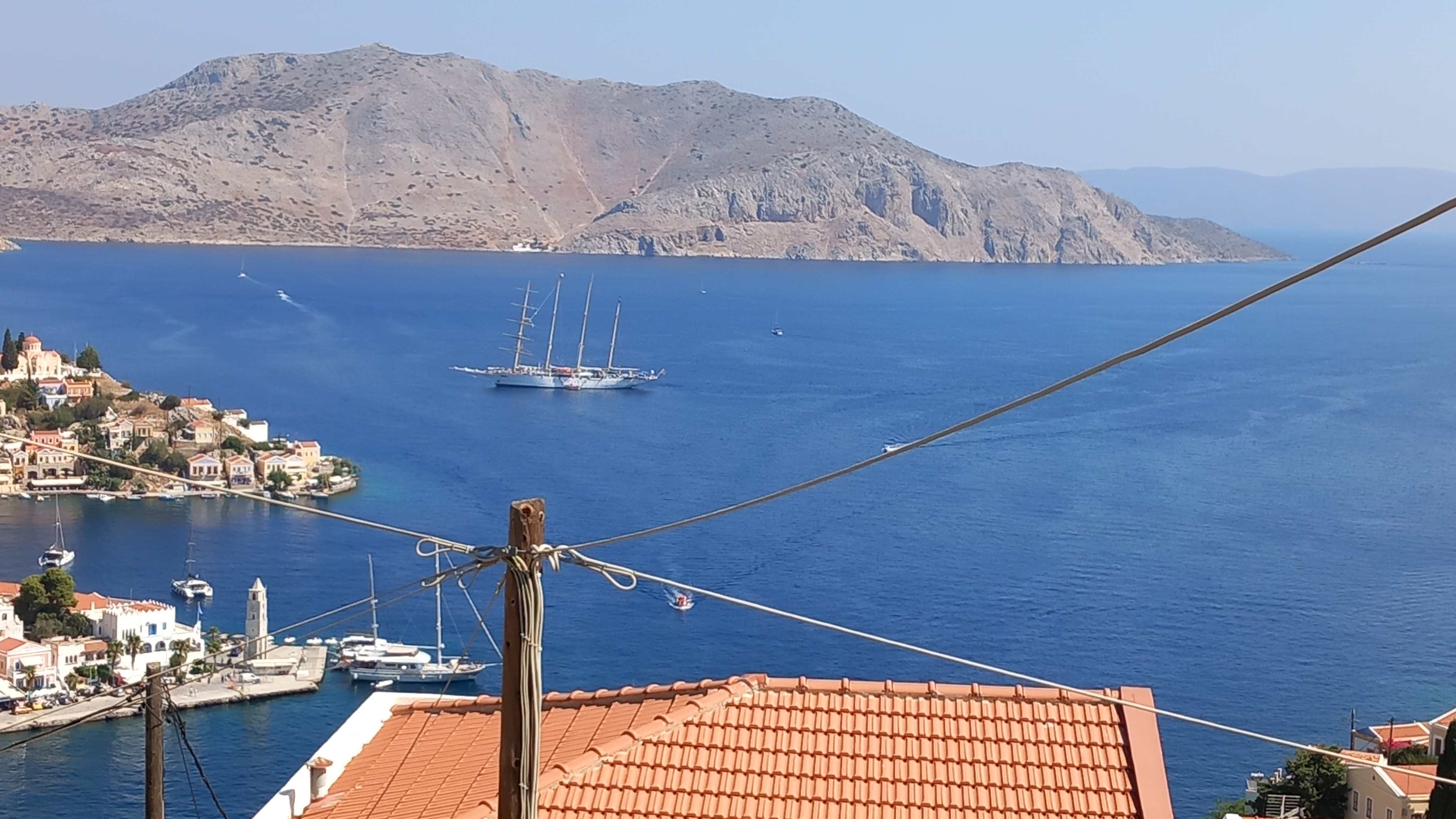 To see us into the weekend, there are a couple more photos taken when wandering aimlessly around the village. The narrow lanes, a Turkish-looking casing around what I assume was once a courtyard a door, a lane showing the old Vs the renovated, and a shot of a ship. (Make sure you don’t get your vowels mixed up on that one.) There was a barquentine in view yesterday. The Star Clipper from Star Clippers Cruises carries up to 170 passengers and 72 crew, was built in 1992, and looked majestic. My photo doesn’t do it justice, of course. It would be good to one day see one of these tall ships with its sails up, but there’s not much point in them doing that when moored off an island for a day.