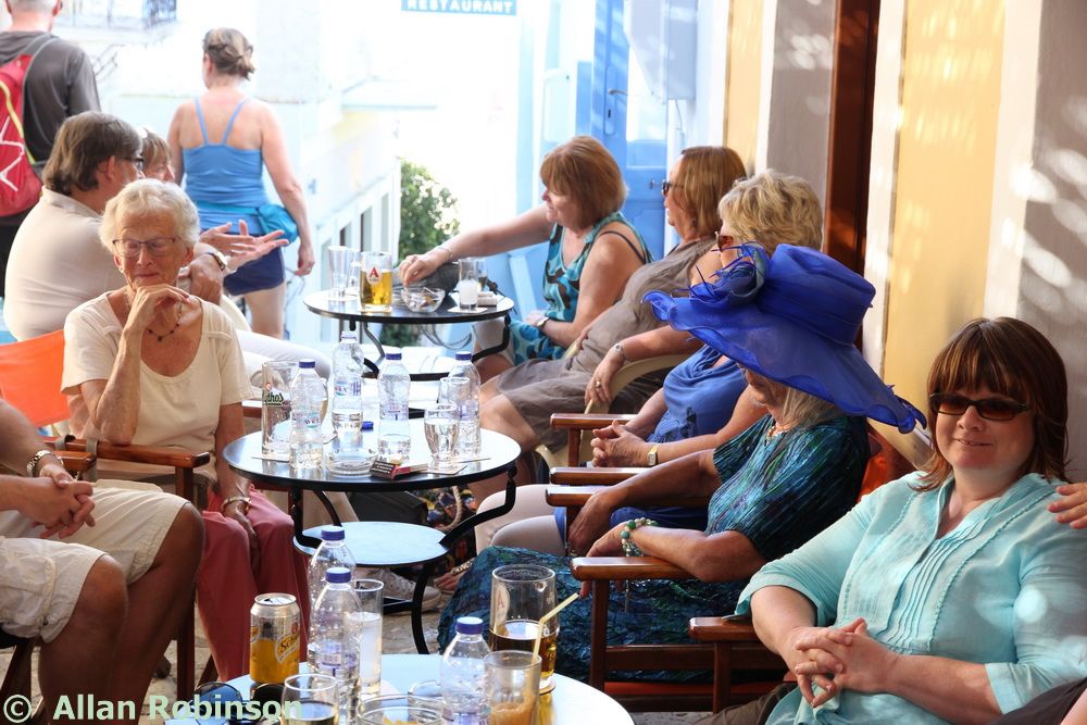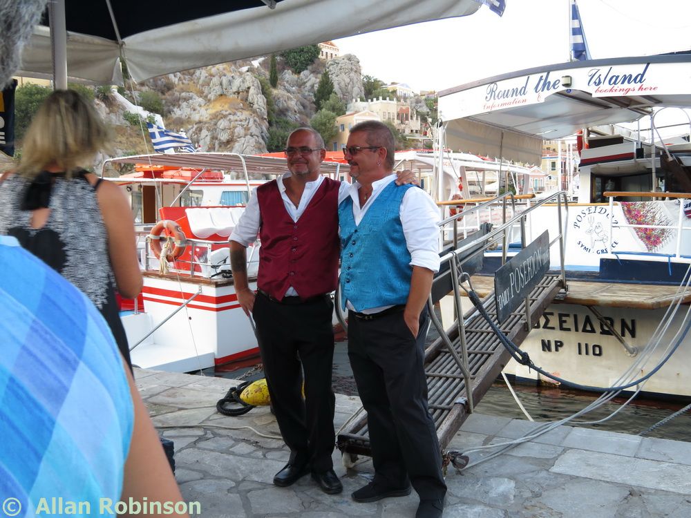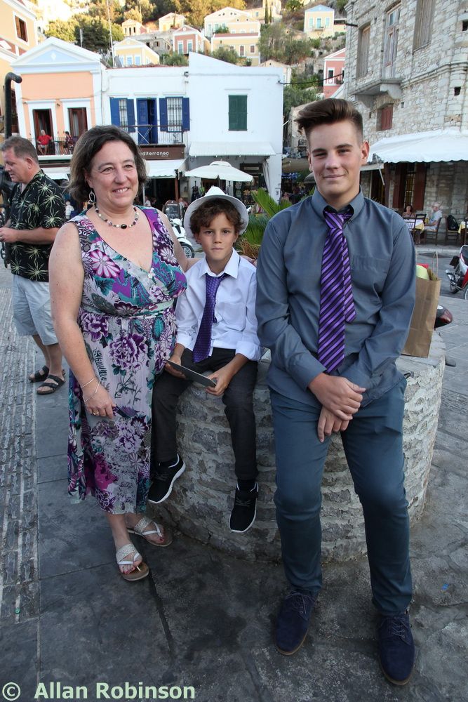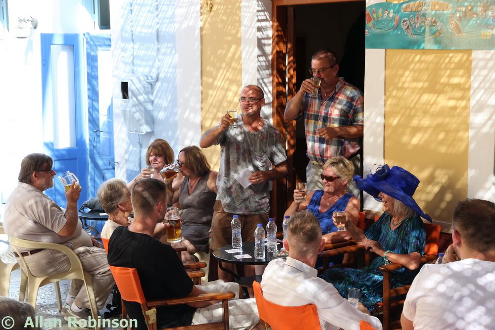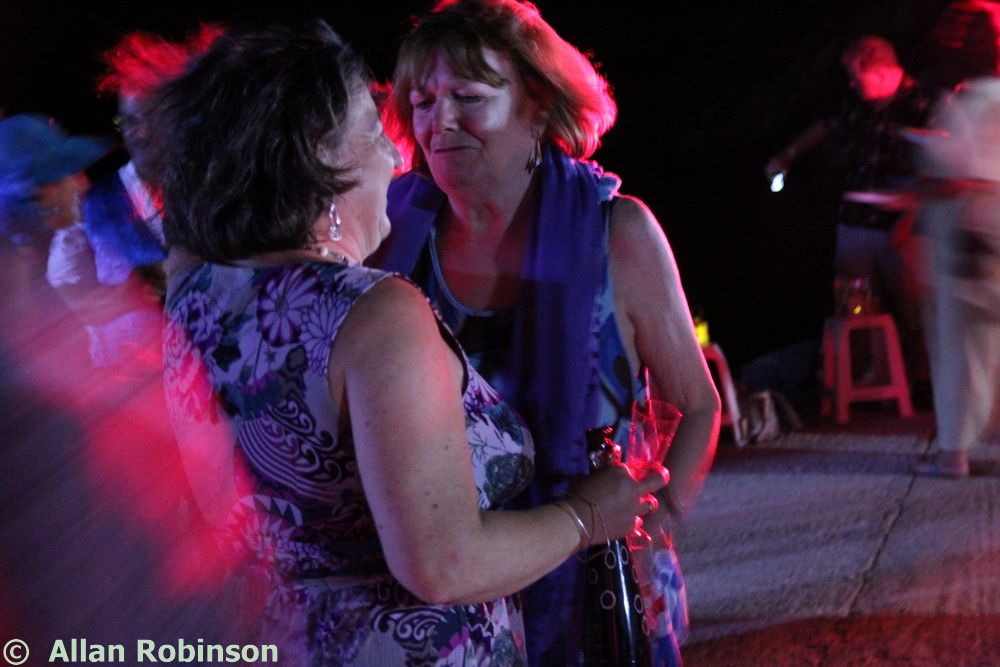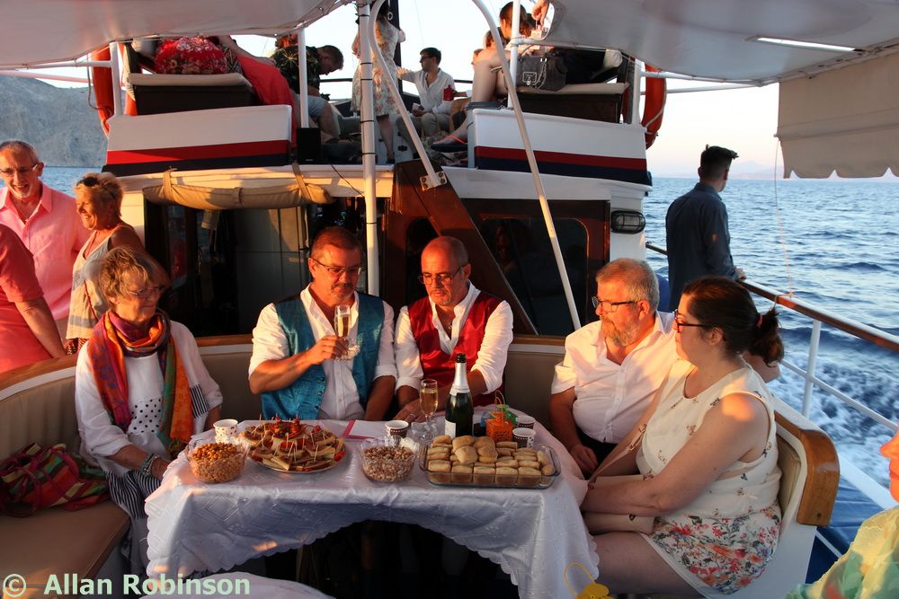 The music we had chosen for the evening was varied. My Symi Dreams album of piano impros was played while everyone was setting up, there were a couple of my own songs involved, as I’ve said, and a selection of numbers that meant something to us. These ranged from Neil’s classic birthday song ‘Let me Entertain you’ by Robbie Williams, to ‘The Rhythm of Life’ from Sweet Charity, a fav of mine, and from the Steve Miller Band to The Monster Mash. When I was about 15, I played in a swing band and we appeared on ‘Swap Shop’ playing ‘Pennsylvania 6500’ so we played that number too. But musically, for me, there were two special moments. One was playing music by my best school friend, Andrew T MacKay, now an important composer of film and other music in India; we had this playing on the way back from Taviri, crossing the flat-calm sea on the boat with the lights of Symi twinkling us safely into port. The other was a number called ‘Nou’s Blue’ composed and arranged by my brother and recorded by him and his band. My mother and I danced to this; another special moment.