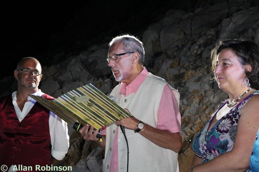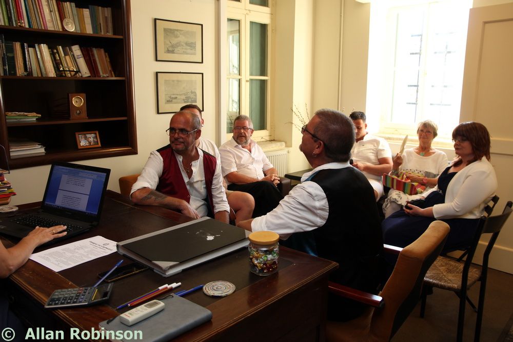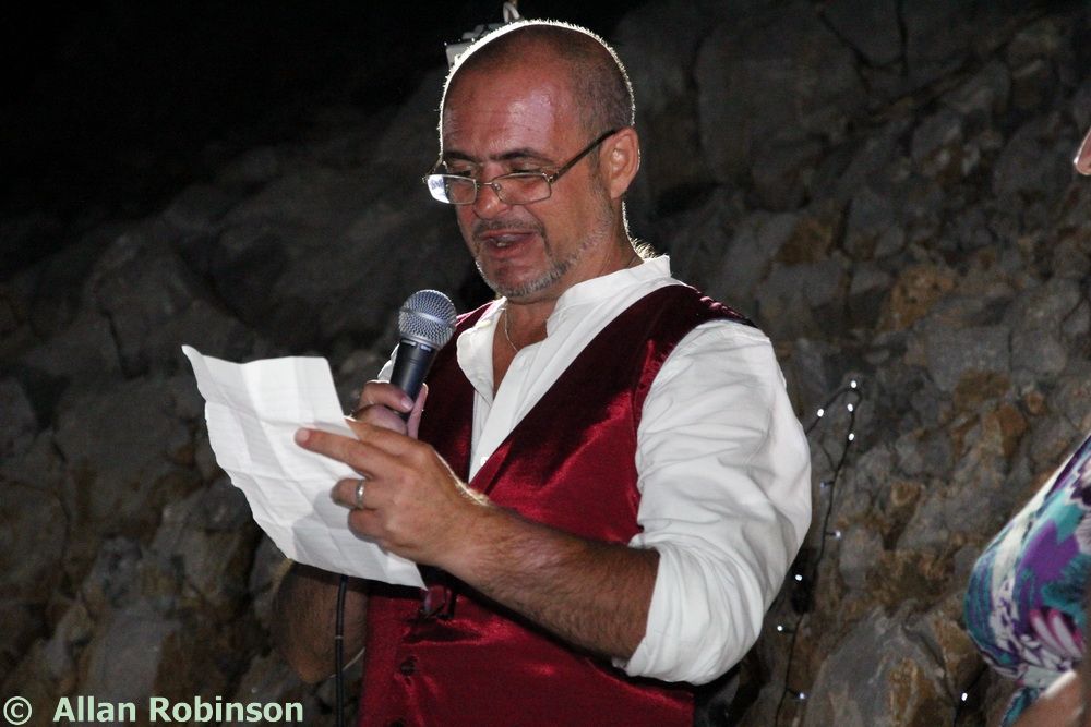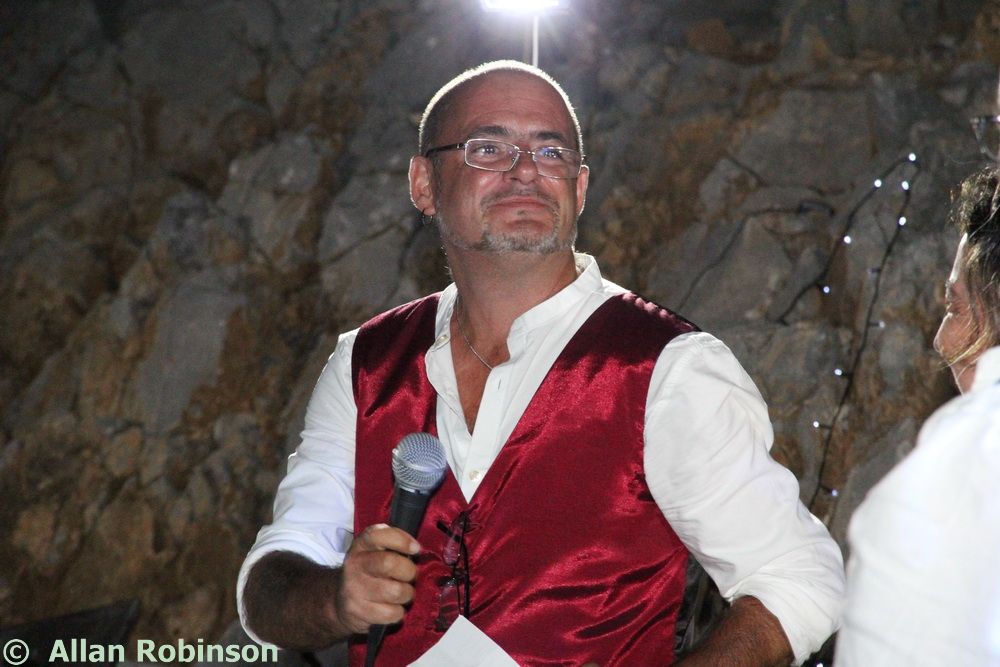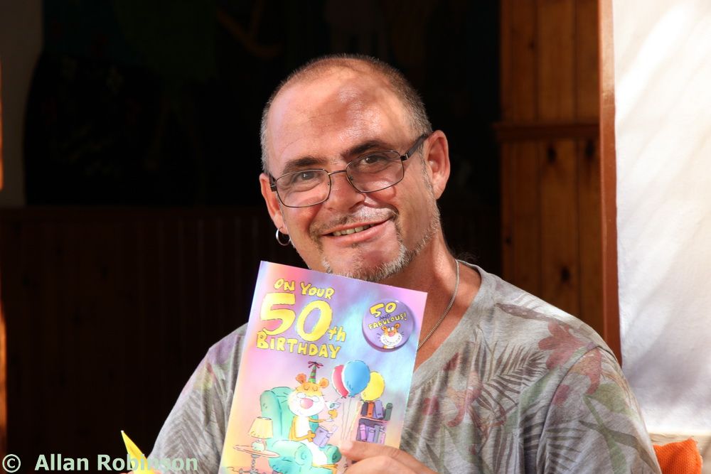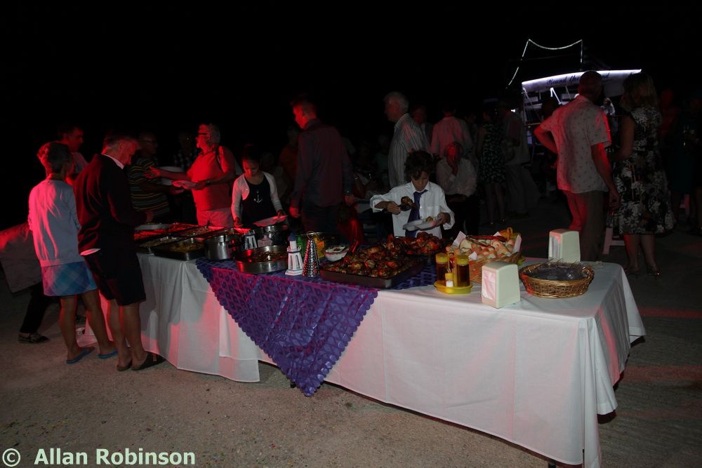 The music we had chosen for the evening was varied. My Symi Dreams album of piano impros was played while everyone was setting up, there were a couple of my own songs involved, as I’ve said, and a selection of numbers that meant something to us. These ranged from Neil’s classic birthday song ‘Let me Entertain you’ by Robbie Williams, to ‘The Rhythm of Life’ from Sweet Charity, a fav of mine, and from the Steve Miller Band to The Monster Mash. When I was about 15, I played in a swing band and we appeared on ‘Swap Shop’ playing ‘Pennsylvania 6500’ so we played that number too. But musically, for me, there were two special moments. One was playing music by my best school friend, Andrew T MacKay, now an important composer of film and other music in India; we had this playing on the way back from Taviri, crossing the flat-calm sea on the boat with the lights of Symi twinkling us safely into port. The other was a number called ‘Nou’s Blue’ composed and arranged by my brother and recorded by him and his band. My mother and I danced to this; another special moment.