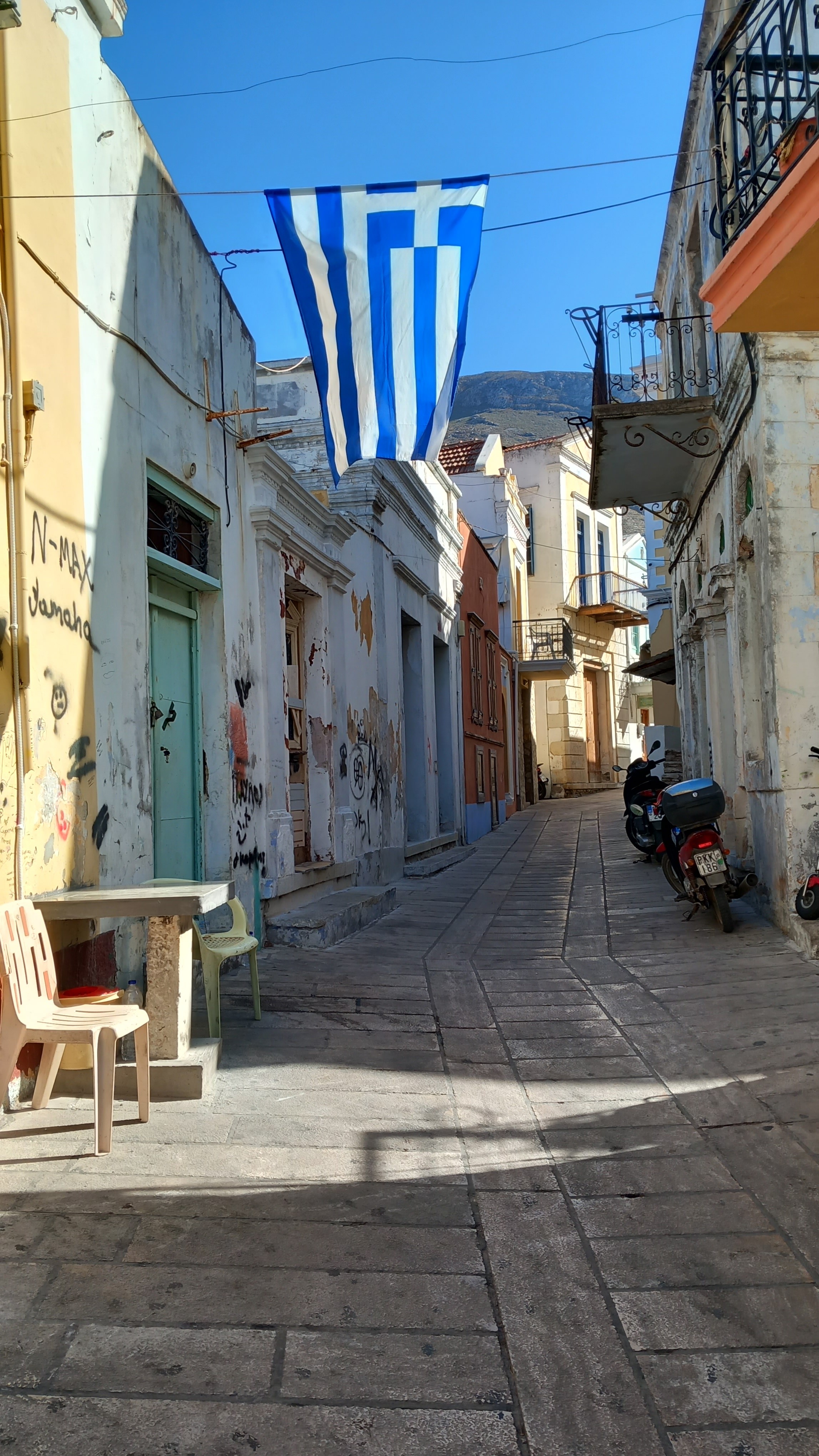 These aren’t the best photos ever, but they show you three different locations. Horio and the ‘main street’, which is just wide enough for a very small truck or a carefully driven car, a square at the back of Yialos, and a view at the top of the main road by the windmills. If you look around blogs, social media, print magazines and websites, you will see stunning photos of Symi, the harbour and the neoclassical houses, but it also has beauty in the day-to-day. Like the ‘main street’ of Horio with the walls where bored and over-excited children have applied their marker pens, and where the flag gets changed only now and then. Where there are no glitzy high-fashion outlets for oligarchs on super-yachts, but a simple bakery, a butcher’s shop, some homely tavernas and other small businesses that keep the village alive.